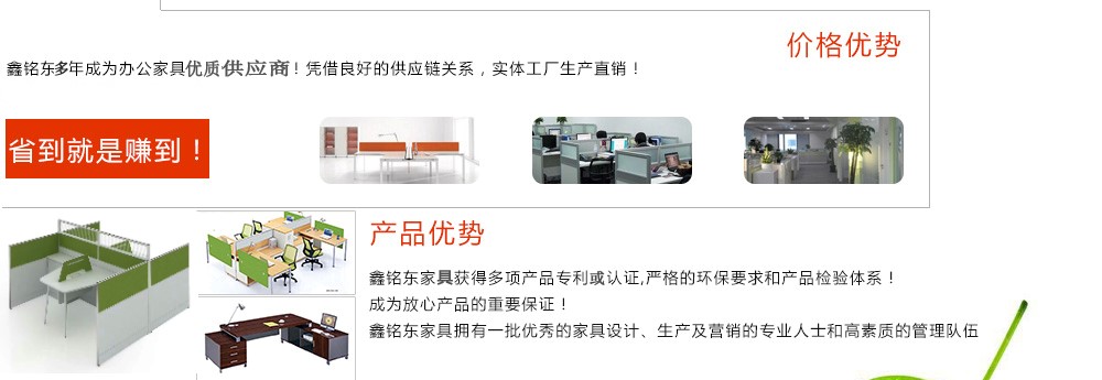 深圳市鑫銘東家具有限公司專業(yè)銷售各類辦公家具!產(chǎn)品涉及多種系列,如:班臺(tái)、班椅、屏風(fēng)、會(huì)議桌、會(huì)議椅、辦公沙發(fā)、茶幾、辦公桌、文件柜、電腦桌椅、各式餐臺(tái)、餐椅、書柜等辦公家具。 鑫銘東家具擁有一批優(yōu)秀的家具設(shè)計(jì)、生產(chǎn)及營(yíng)銷的專業(yè)人士和高素質(zhì)的管理隊(duì)伍。銘東家具以"先難后易"之戰(zhàn)略,在產(chǎn)品結(jié)構(gòu)、產(chǎn)品質(zhì)量及服務(wù)水平方面,均推陳出新,力求完善,精益求精。使我們的產(chǎn)品質(zhì)量保持在國(guó)內(nèi)外家具潮流的先進(jìn)水平,力求滿足客戶的特殊需求。鑫銘東家具多年來(lái)致力于環(huán)保、實(shí)用家具的設(shè)計(jì)與開發(fā),集生產(chǎn)、銷售、服務(wù)于一體。本著"以人為本"的設(shè)計(jì)理念,大量開發(fā)符合人體工程學(xué)的各種產(chǎn)品,以"誠(chéng)信為本"的質(zhì)量方針,真材實(shí)料,認(rèn)認(rèn)真真做產(chǎn)品,實(shí)實(shí)在在做人。鑫銘東家具更致力于創(chuàng)造"零維修率"的制造境界,實(shí)現(xiàn)"沒(méi)有維修的服務(wù)才是最好服務(wù)"的口號(hào)》了解更多